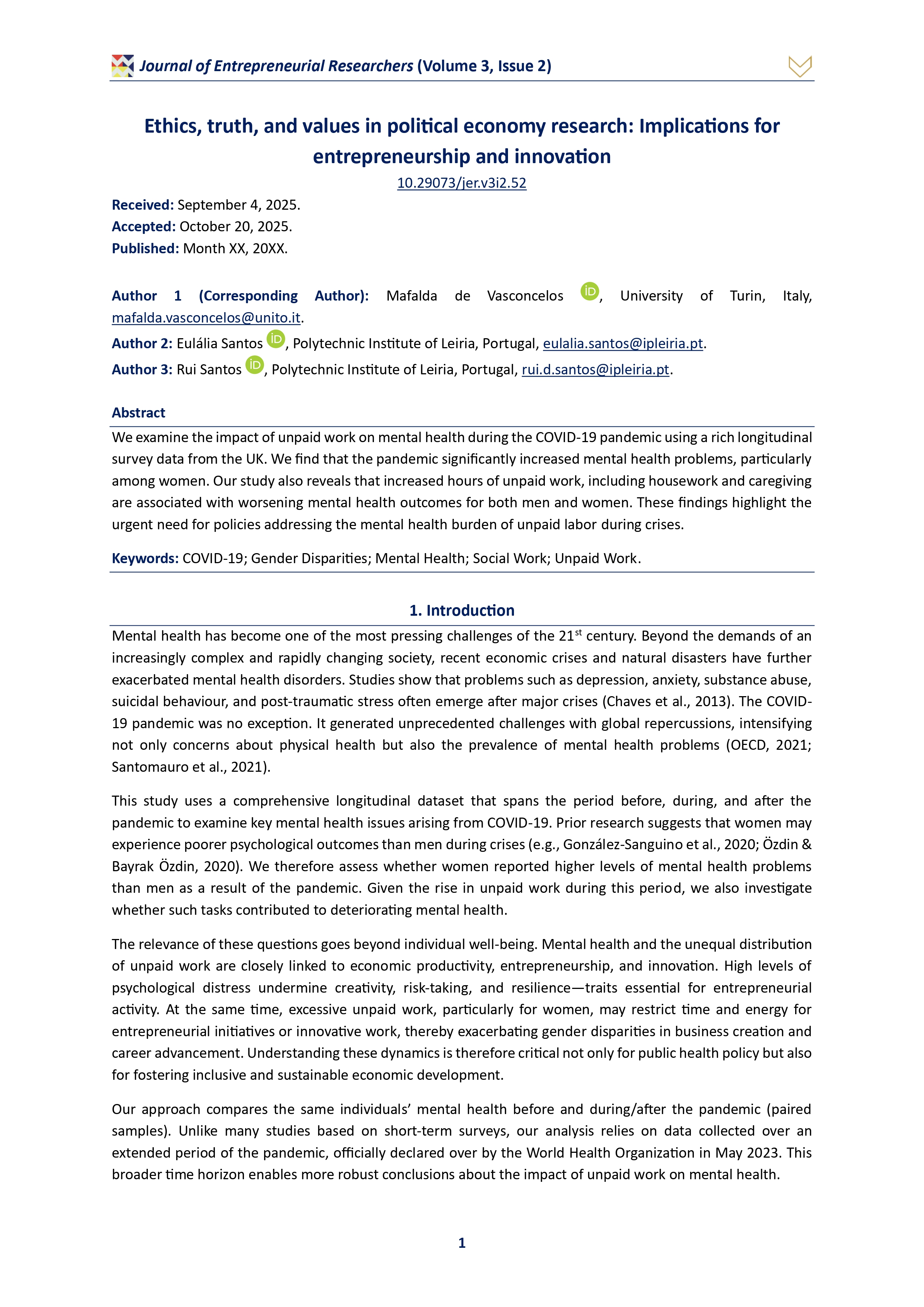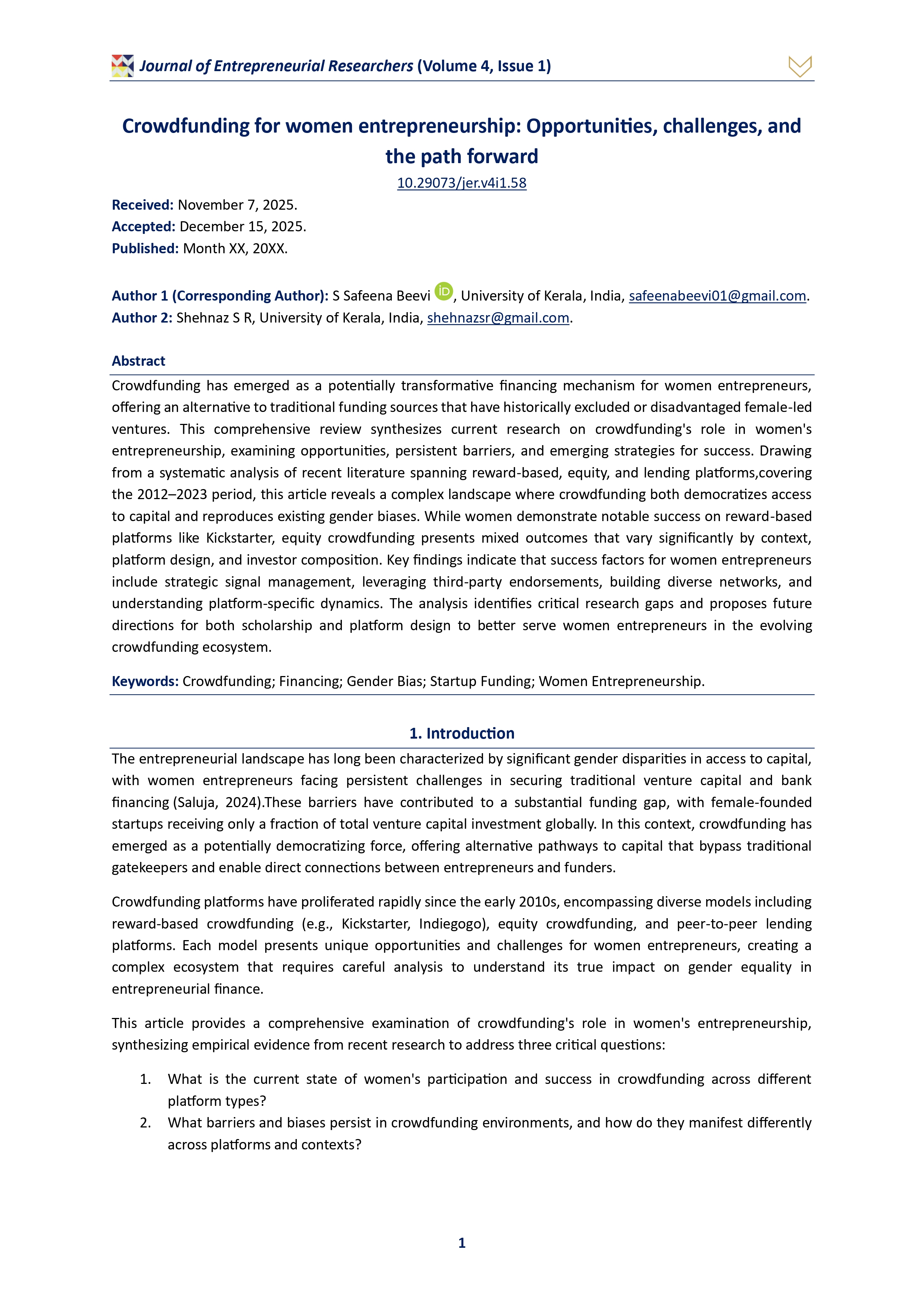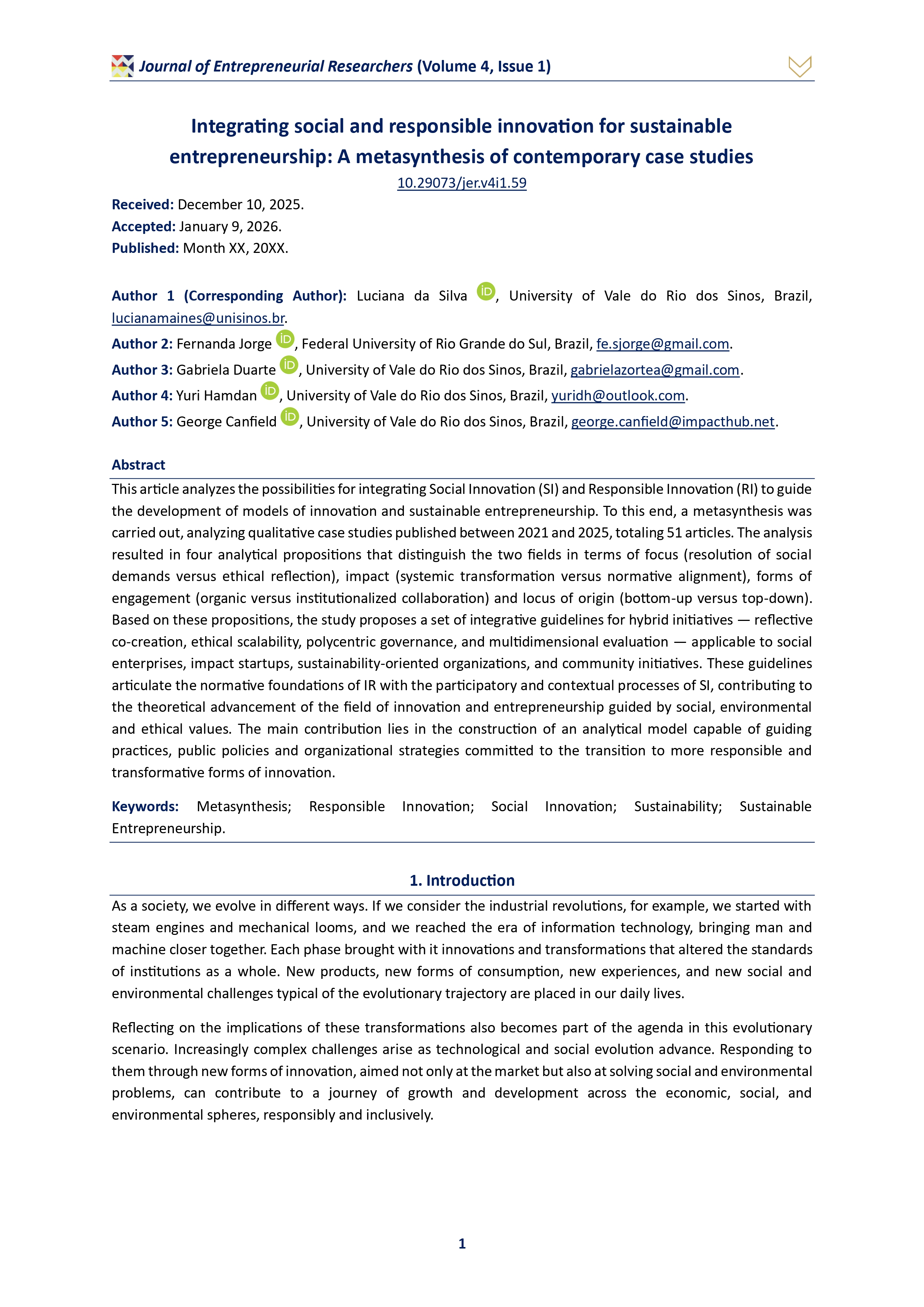 JER promotes the research, development, application, and dissemination of innovative approaches within the entrepreneurial research domain, fostering critical and transformative perspectives on entrepreneurship as both a scientific and societal endeavor.